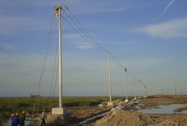 連云新城三期供電線路緊貼海堤邊。受海堤建設(shè)進(jìn)度和海風(fēng)海潮的影響,低矮的壩堤經(jīng)常被風(fēng)刮起的海浪浸頂,石塊突起,洼水漣漪,淤泥纏足,堤邊路面凹凸不平,道路僅限一輛車通行,擁擠不堪,工程施工難度極大。為提升速度,加快進(jìn)度,臺北供電所克服困難,緊鑼密鼓地展開工作,以期早日完工?,F(xiàn)場勘察地形地貌,了解潮汐運(yùn)動規(guī)律,制定施工計劃,設(shè)計措施方案,組織人力,采購材料,投入施工。施工人員采用彈性工作時間,利用落潮時機(jī),搶運(yùn)電桿,及時立桿和裝配。職工們發(fā)揚(yáng)不怕苦,不畏難的精神,不懼海風(fēng)吹臉、海水浸衣,爬上距離海平面二十多米仿佛搖擺不定的高桿,懸在空中一絲不茍地操作,保障了工程的全面竣工。