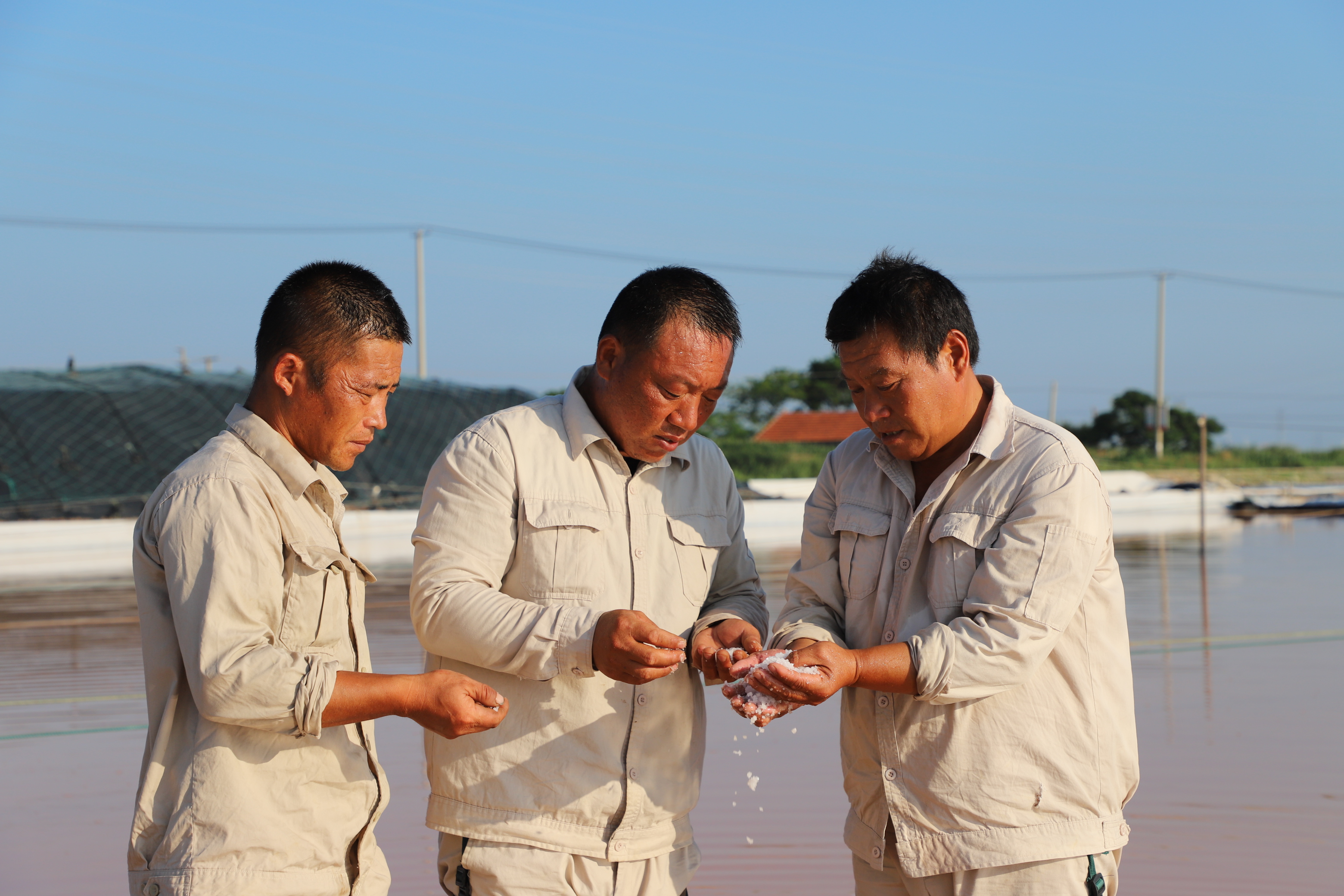 “氣溫越高,鹽的蒸發(fā)量就越高,公司效益就好,按今年的產(chǎn)鹽趨勢,超額完成公司指標任務(wù)應該不成問題,我們工人心里也高興呀!”勞模祝星星擦著臉上的汗珠自豪的說道?!扒缣煲簧砗?,雨天一身泥”是制鹽人的家常便飯,為確保汛期安全生產(chǎn),避開高溫時段作業(yè),凌晨五點鐘,工人們已忙著鹵水除硫、維護收拉塑布收房系統(tǒng)、修補塑布……。鹽工身上的汗水與鹵水交織在一起,浸濕了工作服,透過驕陽他們黝黑的臉龐顯得越發(fā)的锃亮。