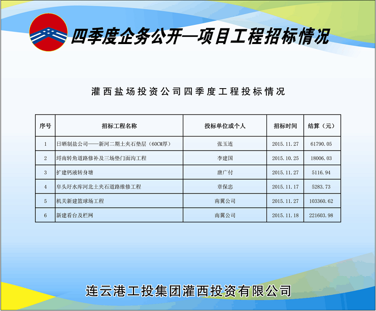 四季度灌西共開工建設(shè)6個(gè)工程項(xiàng)目,分4次由投資公司招標(biāo)領(lǐng)導(dǎo)小組采用公開邀標(biāo)形式進(jìn)行了招標(biāo)。