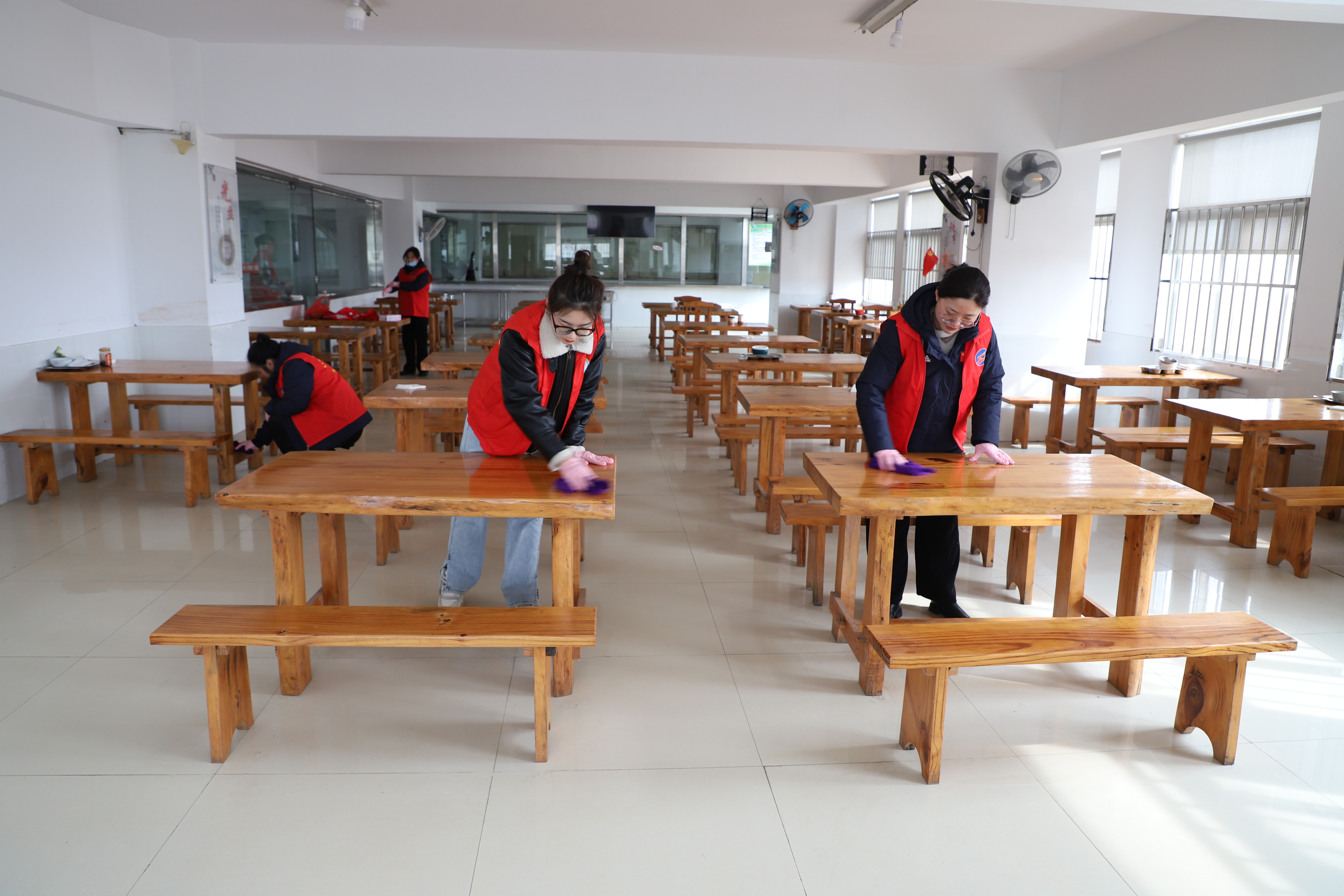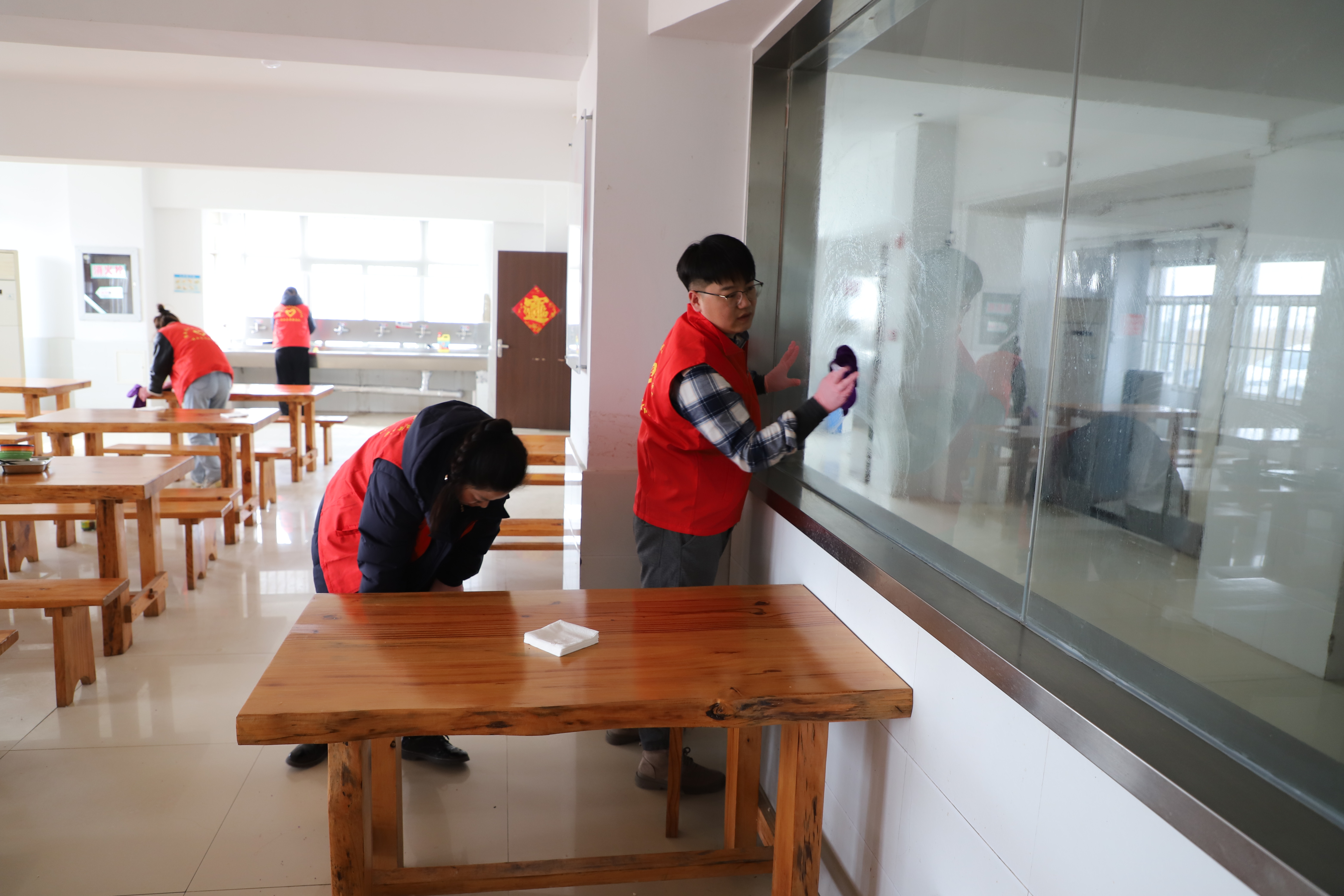 在食堂里隨處可見的志愿者兢兢業(yè)業(yè)的忙碌著,他們不怕臟,不怕累,不遺漏任何衛(wèi)生死角,他們分工合作,有的擦窗,有的抹地,有的清掃垃圾,干勁十足,呈現(xiàn)出一派熱火朝天的勞動(dòng)場面。經(jīng)過兩個(gè)小時(shí)的辛勤勞動(dòng),食堂環(huán)境煥然一新。(西團(tuán))