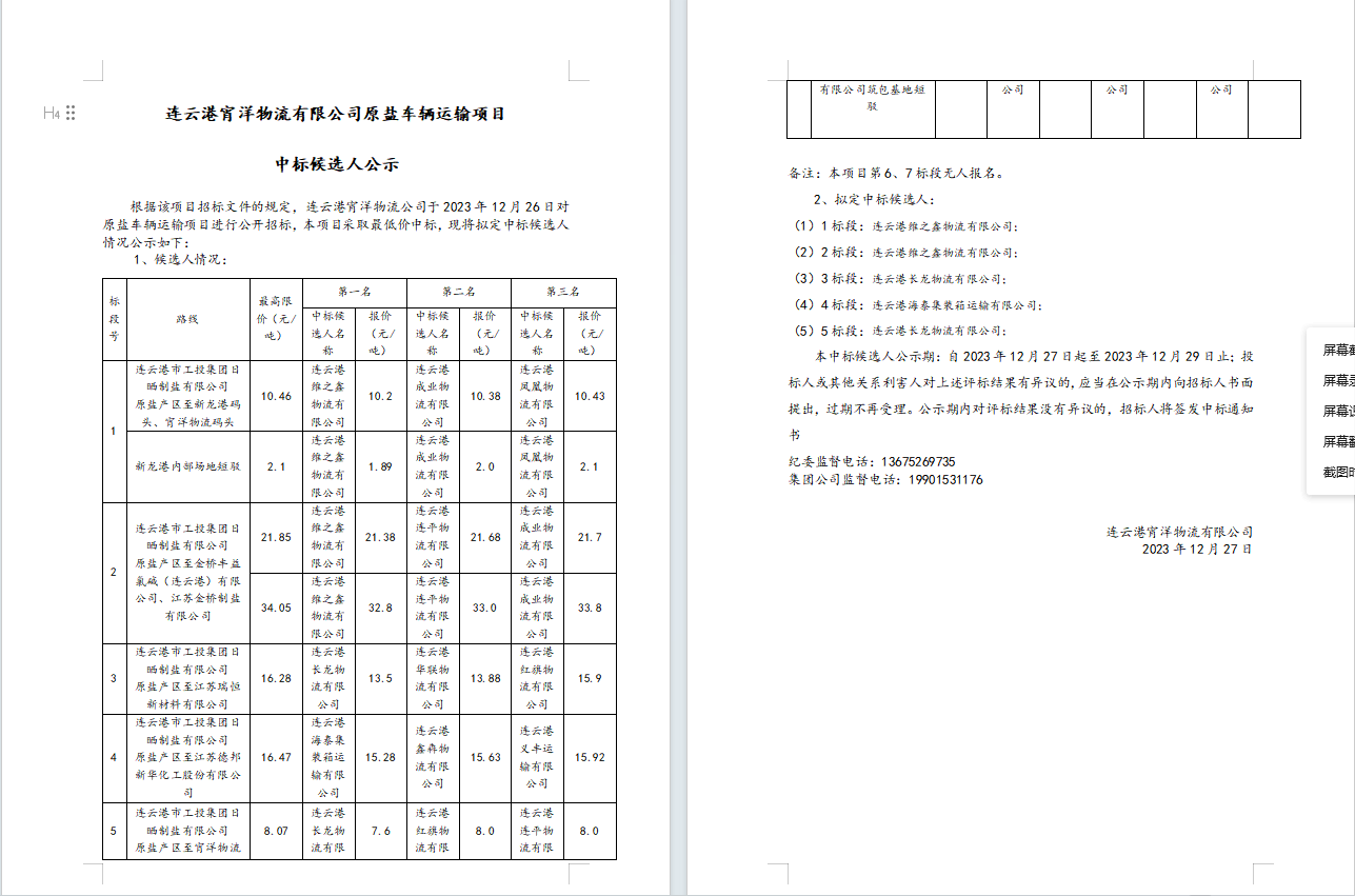 連云港宵洋物流有限公司原鹽車輛運(yùn)輸項(xiàng)目中標(biāo)候選人公示