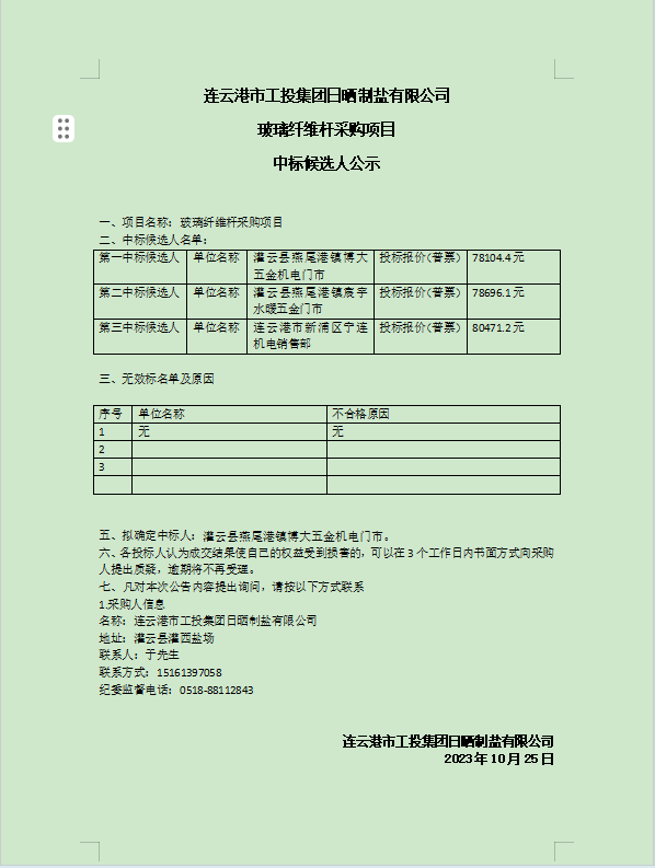 連云港市工投集團(tuán)日曬制鹽有限公司玻璃纖維桿采購項目中標(biāo)候選人公示