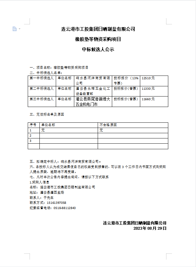 連云港市工投集團日曬制鹽有限公司橡膠墊等物資采購項目中標候選人公示