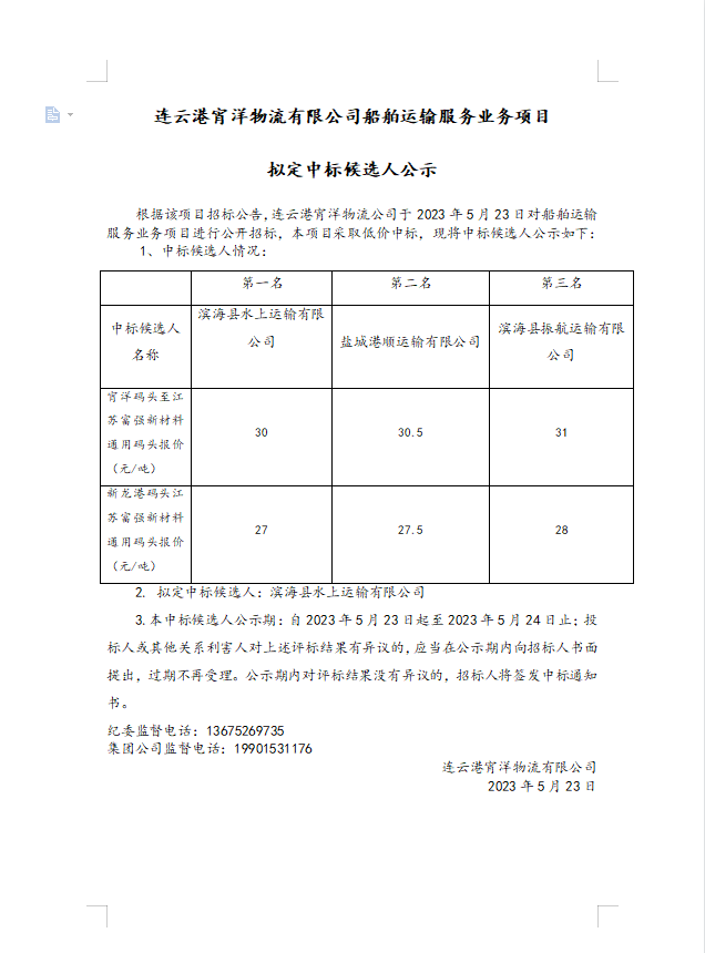 連云港宵洋物流有限公司船舶運輸服務業(yè)務項目擬定中標候選人公示