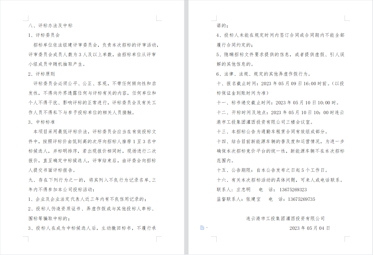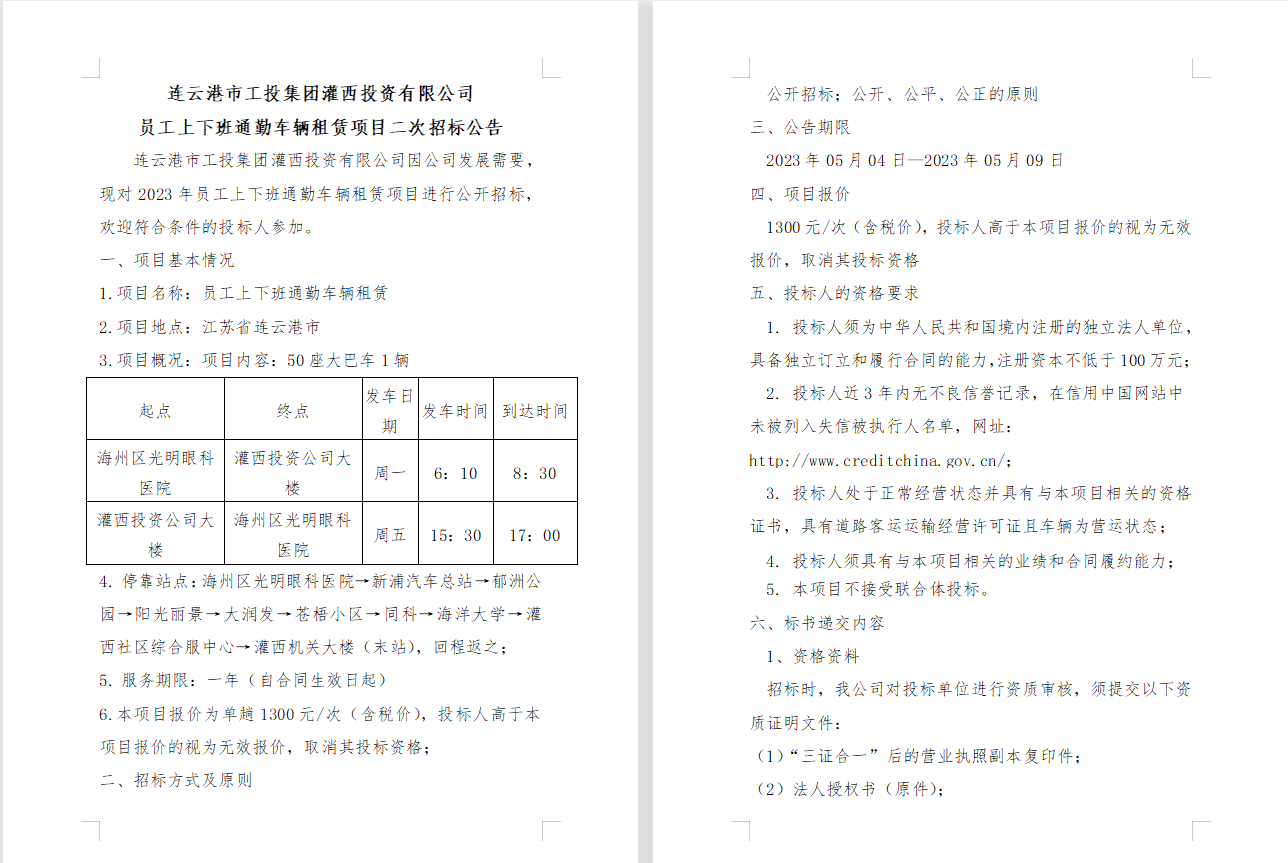 連云港市工投集團(tuán)灌西投資有限公司 員工上下班通勤車輛租賃項(xiàng)目二次招標(biāo)公告
