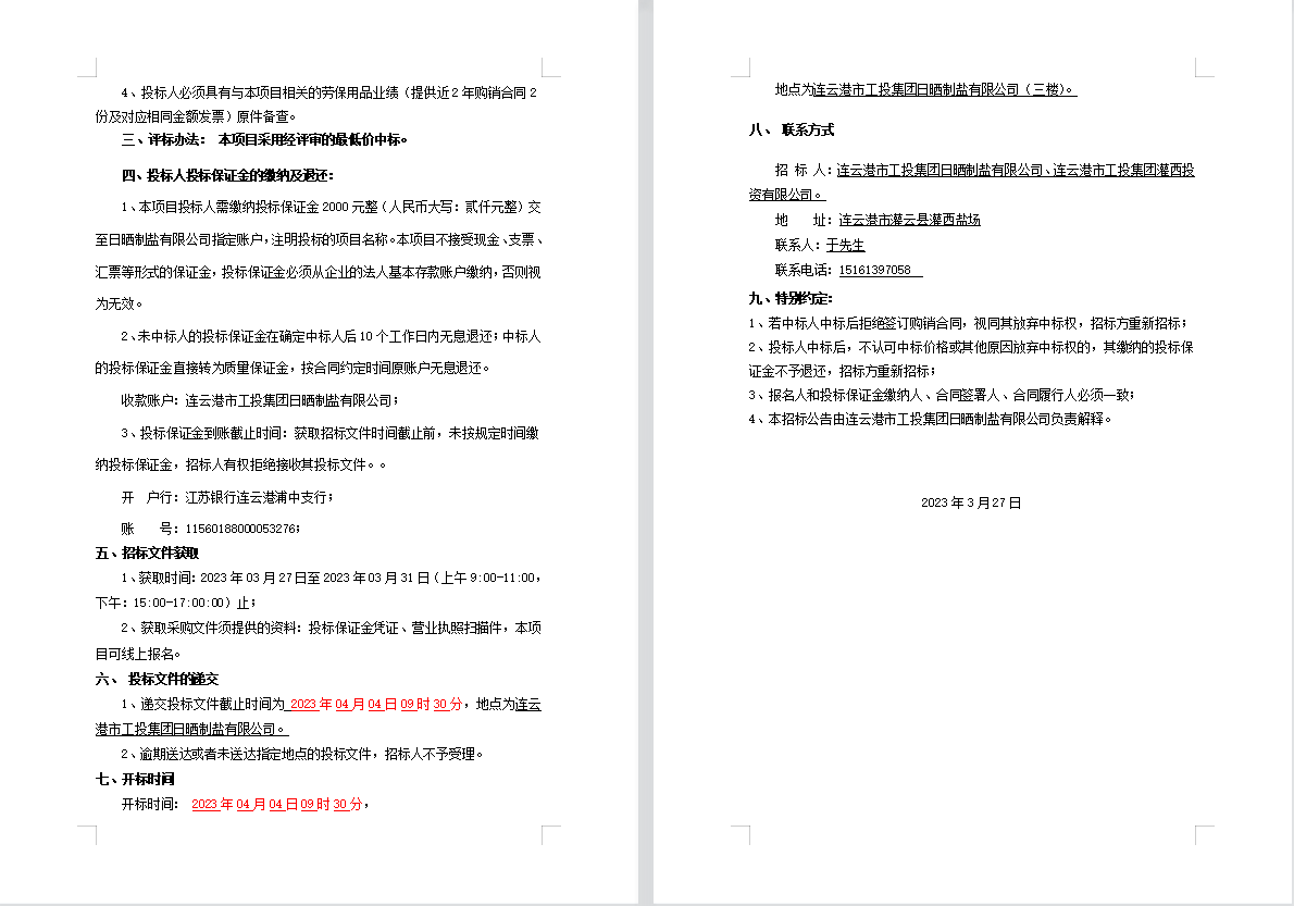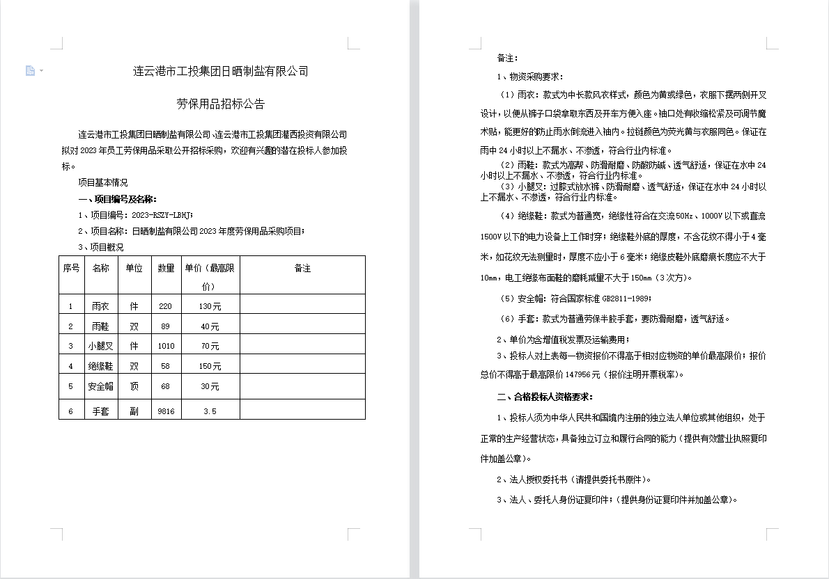 連云港市工投集團(tuán)日曬制鹽有限公司勞保用品招標(biāo)公告