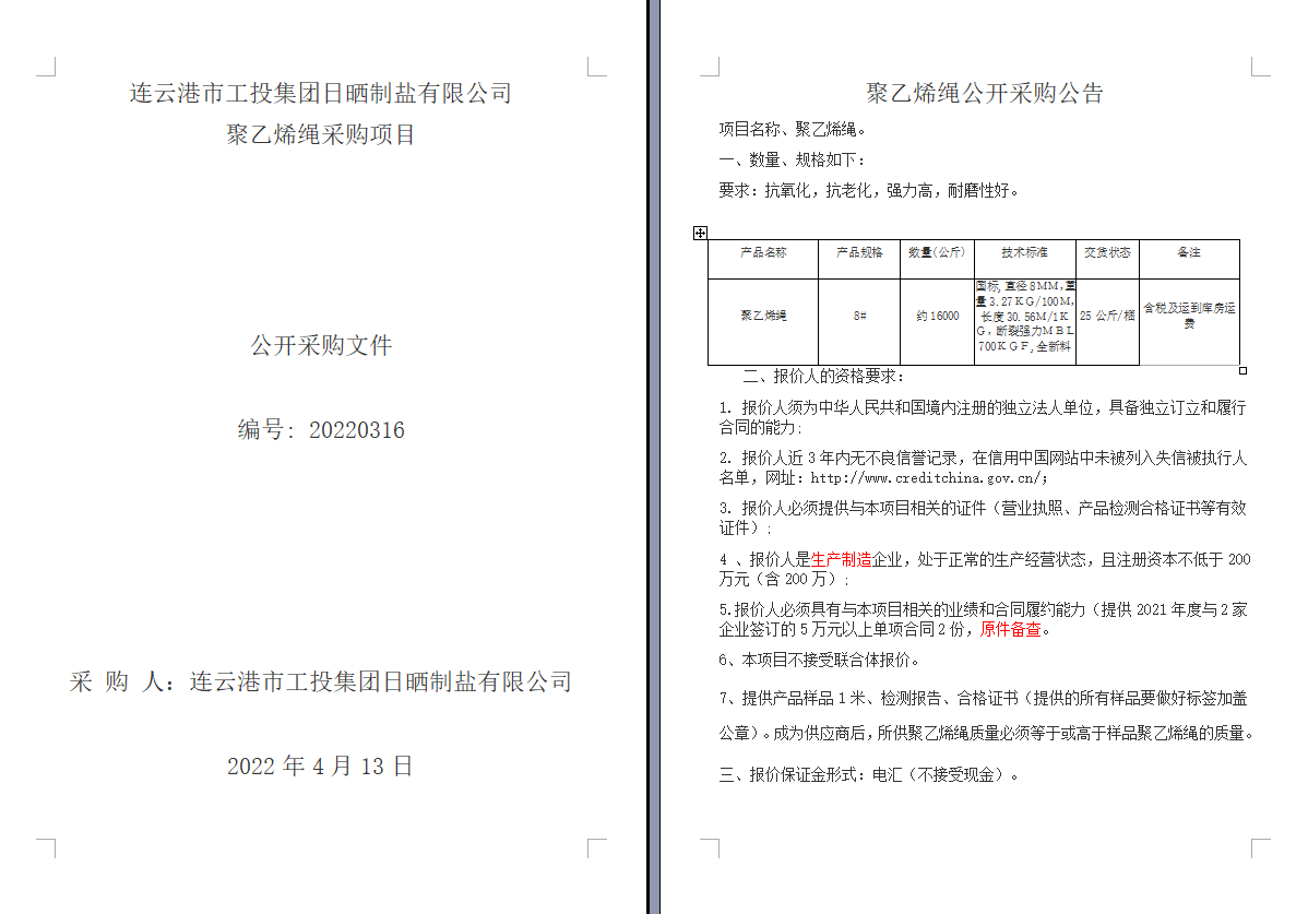 連云港市工投集團(tuán)日曬制鹽有限公司聚乙烯繩采購項目
