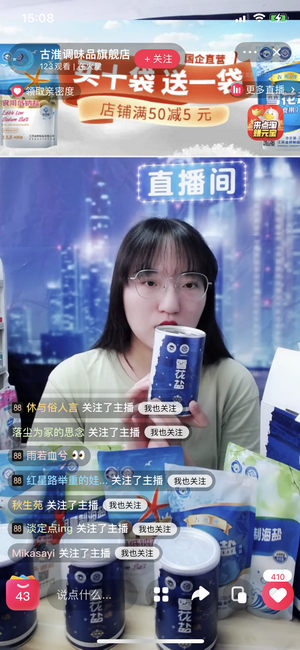 下午3:00,直播正式開始。主播通過網(wǎng)絡(luò)平臺(tái)向粉絲們?cè)诰€介紹了金橋制鹽數(shù)款產(chǎn)品,其中包括雪花鹽、低鈉鹽、日曬海鹽等諸多品種,與粉絲分享淮鹽文化和知識(shí)。在首場(chǎng)直播中,近1000多名粉絲走進(jìn)直播間圍觀、點(diǎn)贊和下單心儀產(chǎn)品。