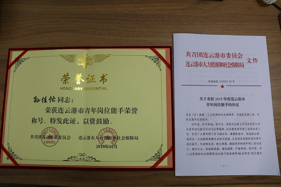 格斯達擔保公司業(yè)務一部副經理、贛榆分部副經理孫佳忙同志,榮獲2018年度連云港市“青年崗位能手”榮譽稱號。