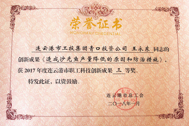 王永東經(jīng)多年摸索研究與實驗總結(jié)出的《造成沙光魚產(chǎn)量降低的原因和防治措施》,曾在《北方水產(chǎn)》上刊登。公司工會收集資料,申報市職工科技創(chuàng)新項目。因該項技術(shù)成熟可靠,對沙光魚各種疾病愈后效果良好而得到認(rèn)可,最終獲得2017年度連云港市職工科技創(chuàng)新成果三等獎。