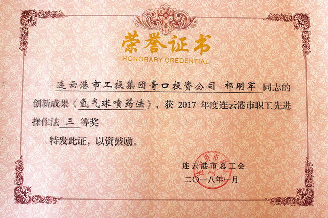 祁明軍的《氫氣球噴藥法》獲得2017年度連云港市職工先進(jìn)操作法三等獎。由他發(fā)明的氫氣球噴藥法,噴藥機結(jié)構(gòu)簡單,成本低廉,且可靈活調(diào)整,省工省時,霧化效果好。目前該操作法已在青口公司全面推廣使用?!。ㄇ喙ぃ?/span>
