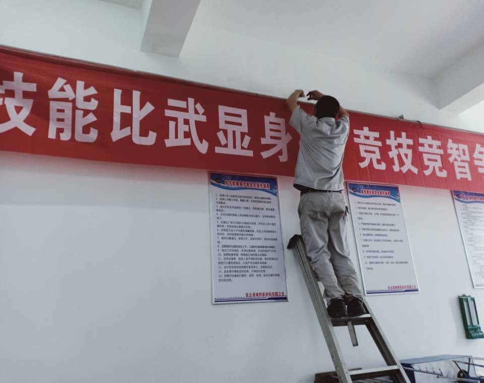 ? ? ? ? ??為營造技能大賽氛圍,7月7日上午,品質(zhì)管理部特地請維修組件班組朱師傅、王師傅在品質(zhì)管理部辦公區(qū)掛上宣傳橫幅。維修組件班組的兩位師傅不怕麻煩,多次調(diào)整橫幅的角度,力求做到盡善盡美,為營造技能大賽氛圍貢獻(xiàn)自己的力量。