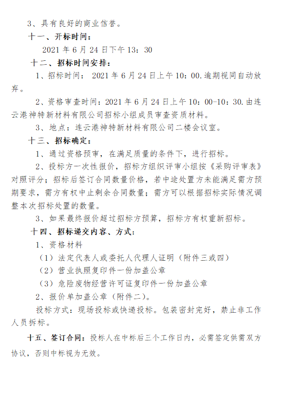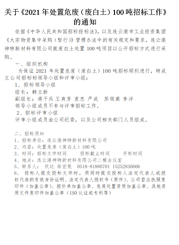 關(guān)于《2021年處置危廢(廢白土)100噸招標(biāo)工作》的通知