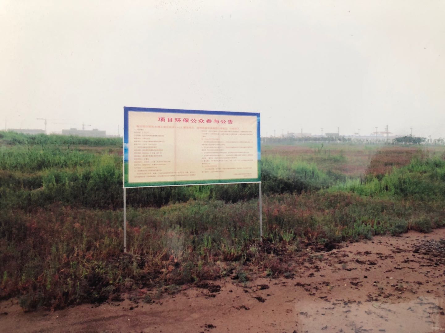 這是神特公司籌建時期的環(huán)評現(xiàn)場公示照片,是2008年8月底拍攝的。照片的重點部分是一個大牌子——項目環(huán)保公眾參與公告的牌子,位置大約在現(xiàn)在一期傳達室附近。做這樣的牌子是當時環(huán)評的一個環(huán)節(jié),必須在建設場地進行兩次公告,征求相關環(huán)境利益方的訴求。牌子的遠方隱隱約約看見有些工廠和電力桿塔,牌子附近生長著茂密的堿蒿,一團團一簇簇,忽高忽低,可以看出地面是很不平整的。當年豎牌子的時候,是雨后不久,地面較為泥濘,建設用地及周邊環(huán)境多多少少透射出一種蒼涼的感覺。