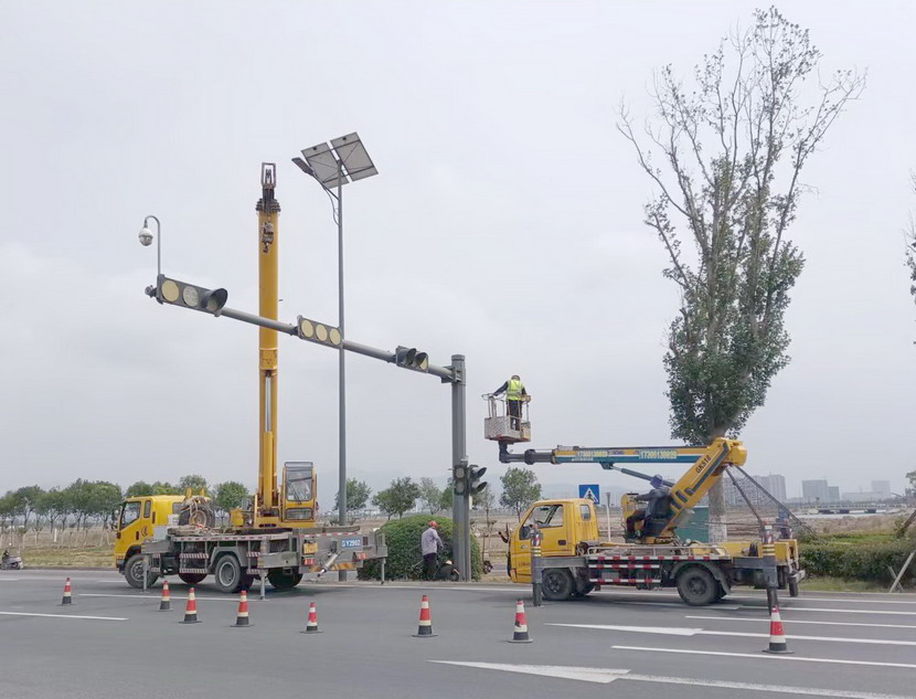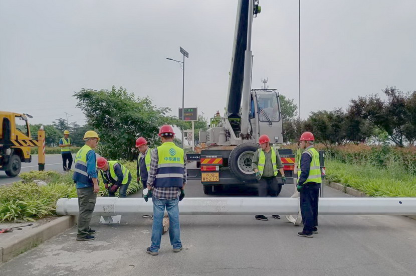隨后,筆者一行,頂著烈日,驅(qū)車前往翔立分公司市政工程現(xiàn)場,在封閉的道路內(nèi),翔立公司一群黃馬甲戰(zhàn)士,正頂著烈日在緊張的進(jìn)行交通監(jiān)控探頭安裝工作。據(jù)了解他們也是5點(diǎn)多種就到崗位上來了。經(jīng)理喬以成帶著兩名員工站在高高的升降機(jī)上,鉗子、扳手、鏍絲刀,各種工具在他們手里輪番操作,汗水已將其工作服的前胸后背浸透。好不容易等到他們安裝完一組探頭下來,我們一邊遞水,一邊采訪,老喬擰開瓶蓋,一口氣喝下半瓶,這才回答我們的問題:“不能不拼啊,我們離盈利還有不小的缺口,現(xiàn)在全公司、全集團(tuán)都在解放思想提質(zhì)增效,不干、不努力哪里來的增效啊!”