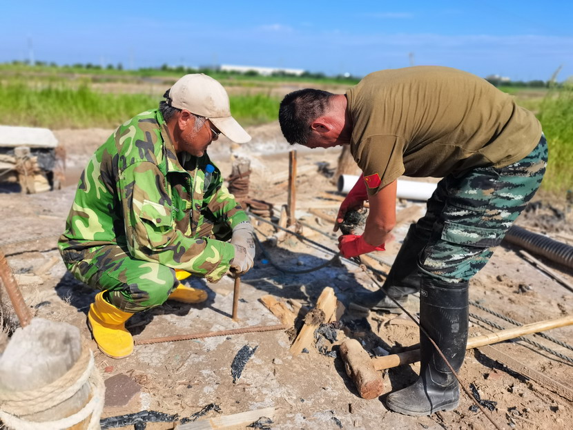 來到海州灣公司灘頭,遠(yuǎn)遠(yuǎn)望見幾名職工在鹽池里勞作,走近一看,組長夏軍正帶領(lǐng)一組人整修塑苫池。“我們5點(diǎn)就出來了,趁早涼,趕緊把塑料布整理一下,布子上都是鹵,長了鹽就不好處理了,搞不好這鹵水還會(huì)淌到外面去,造成浪費(fèi)......”邊說著邊用肩膀頭子蹭一下眼角的汗水,手里的活一直沒停。據(jù)了解,海州灣公司承接臺(tái)北礦鹽和鈣液兩大產(chǎn)業(yè),經(jīng)濟(jì)比重占全公司收入60-70%,當(dāng)前雖然是高溫期,但是廣大職工搶抓汛期難得的晴好天時(shí),每天清晨5點(diǎn)就在灘地上忙碌起來,汗水模糊了雙眼,額頭的汗水順著帽檐往下滴落,身上的衣服一直都是濕漉漉的,緊貼在身上,即便如此,他們也毫不在意,用他們的話:“看著池子里每時(shí)每刻都在落鹽,這點(diǎn)汗就沒白淌啊!”我們臨走的時(shí)候,夏軍還不忘說:“今年我們保證鹽量突破2萬噸,不虧損?!?/span>