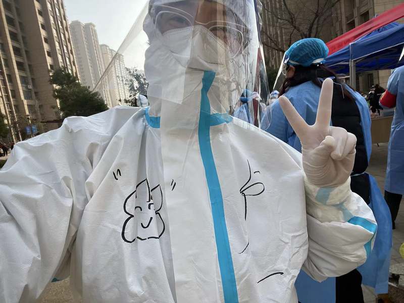 ? 3月12日,晴,8:00到達社區(qū)核酸采樣點,準備上崗,社區(qū)負責人給我們進行了“防護服穿脫”及防疫知識的講解學(xué)習(xí)等一系列十分細致地培訓(xùn)后,有點興奮的穿好“大白服”,帶上手套、頭套和面罩,社區(qū)阿姨還幫我在衣服上畫上了可愛的涂鴉;