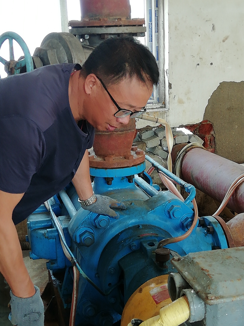 在徐圩運鹽河畔,玻璃鋼管道維修現(xiàn)場,發(fā)電機隆隆轟鳴聲中不時夾雜著角磨機刺耳的打磨音,所到之處風(fēng)塵飄揚。白色塵霧中,一名五十多歲的中年漢子正凝神專注的低頭操作,仔細的打磨著玻璃鋼管道接頭的每一片角落,絲毫不敢馬虎。不時,他摘下眼鏡取下戴在嘴上的防護口罩,鼓起腮幫用力吹去眼鏡上飄落的粉塵。顧不得擦一把額頭上的汗水,戴好眼鏡和口罩,調(diào)整好位置繼續(xù)俯下身打磨,他就是翔立分公司顧圩泵站班組長顧昌全。