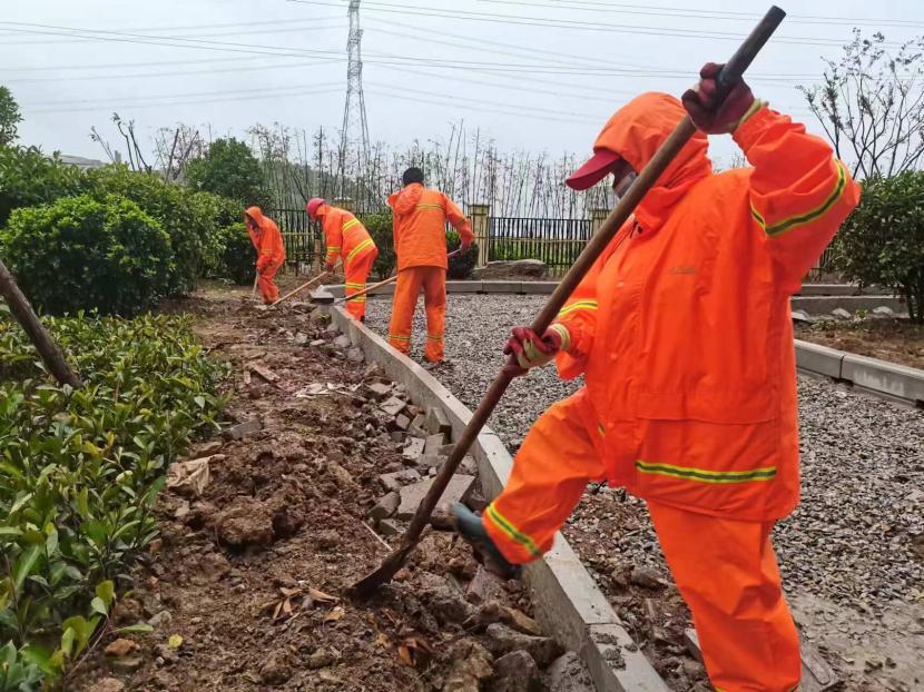 綠化工人無暇顧及這傾盆大雨,他們頭戴草帽,身披雨衣,手中的工具一刻也未曾停歇。他們或是彎腰修剪著路邊瘋長的枝葉,或是蹲在地上清理著被雨水沖刷堆積的雜草。雨水順著他們的臉頰流下,模糊了他們的視線,但他們只是抬手隨意抹一把,便又繼續(xù)投入到工作中。那一雙雙粗糙的手,在風雨中熟練地操作著工具,仿佛在與大自然進行一場無聲的較量。