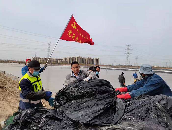 生產(chǎn)現(xiàn)場,一面面紅旗迎風(fēng)招展,先鋒班組組長沈秀成駕駛拖拉機,載著塑布在壟道上來回穿梭,蕩起滾滾煙塵;兩大虎將劉天義、徐勇率領(lǐng)后勤人員將塑布卸到指定單元;退休黨員朱春年帶領(lǐng)兩個小組成員蹚進鹽池,將塑布上肩分別扛到東西堰擺放整齊;青年骨干夏軍班組成員負責塑布安裝,穿孔、打結(jié),一氣呵成。同時,鹵水灌池與塑布安裝同步進行。所有人員在各自崗位上揮汗如雨、辛勤作業(yè),忙而有序,現(xiàn)場呈現(xiàn)出一派熱火朝天的繁忙景象。