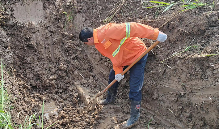 市政分公司組織搶修人員迅速到場,調(diào)集挖機與搶修材料,有序開展應急搶修。維修人員首先對漏水管道實施開挖,經(jīng)過維修人員仔細挖開后確定直徑110PVC管道老化導致管道連接端裂開。查明原因后,制定了相應可行的搶修方案。搶修過程中,大伙不畏困難、分工有序,相互協(xié)作,在滿是泥濘的坑中開展維修作業(yè)。機械開挖、人工配合清淤、更換損壞管道、增設哈夫節(jié)等一系列的步驟,一通操作下來,搶修人員人人汗流浹背。經(jīng)過3個多小時連續(xù)奮戰(zhàn),高效完成此次搶修任務。
