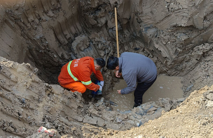 11時,已查明管道漏點處系PE63管道斷裂,至于管道斷裂的原因,判斷是地面沉降使管道落差錯位所致。搶修人員站在2米多深的泥坑里,不怕臟和累,徒手加緊管道搶修。經2個多小時緊張有序搶修,成功將斷裂的水管修好。于當日下午16時30分恢復供水,有力保證了轄區(qū)春季綠化澆灌工作正常開展。(王宜全、楊維軍)