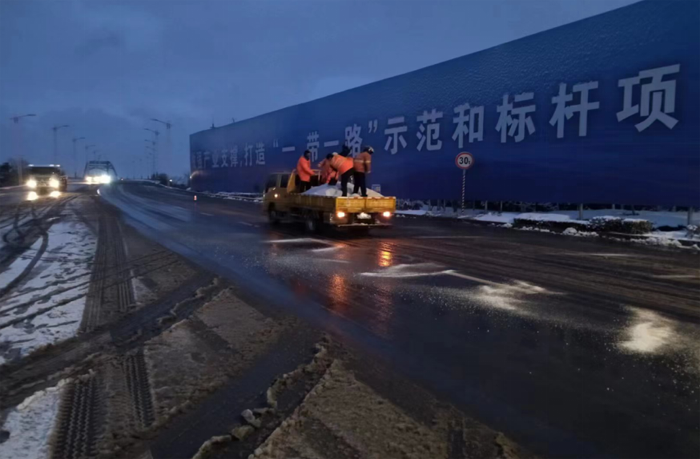 此次掃雪除冰行動(dòng)共40余人參與,調(diào)派鏟雪車、裝載機(jī)等機(jī)械設(shè)備5臺(tái),調(diào)用融雪劑30余噸,采用人機(jī)結(jié)合方式,對(duì)主要干道人行便道、交叉路口等重要地段的路面冰雪進(jìn)行人工突擊清理;對(duì)所轄干道的橋面采用先雪鏟車清理,后鋪灑融雪劑相結(jié)合融化冰雪,循環(huán)進(jìn)行。