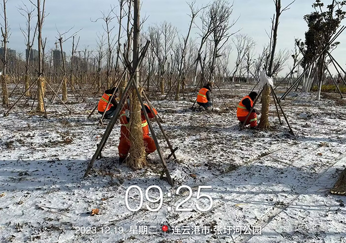 同時,各班組還對新植樹木、不耐寒樹木進行草繩裹干,確保樹木安全越冬。在樹木刷白裹干前刮去樹皮上的粗翹皮和苔蘚等寄生物,清理樹皮縫,堵塞老樹洞,進一步提高園林樹木冬季防寒工作質(zhì)量。