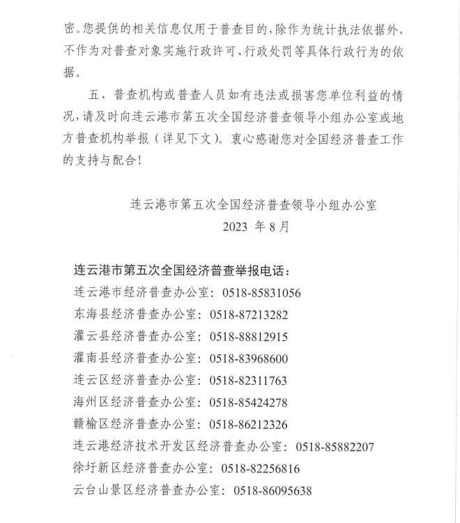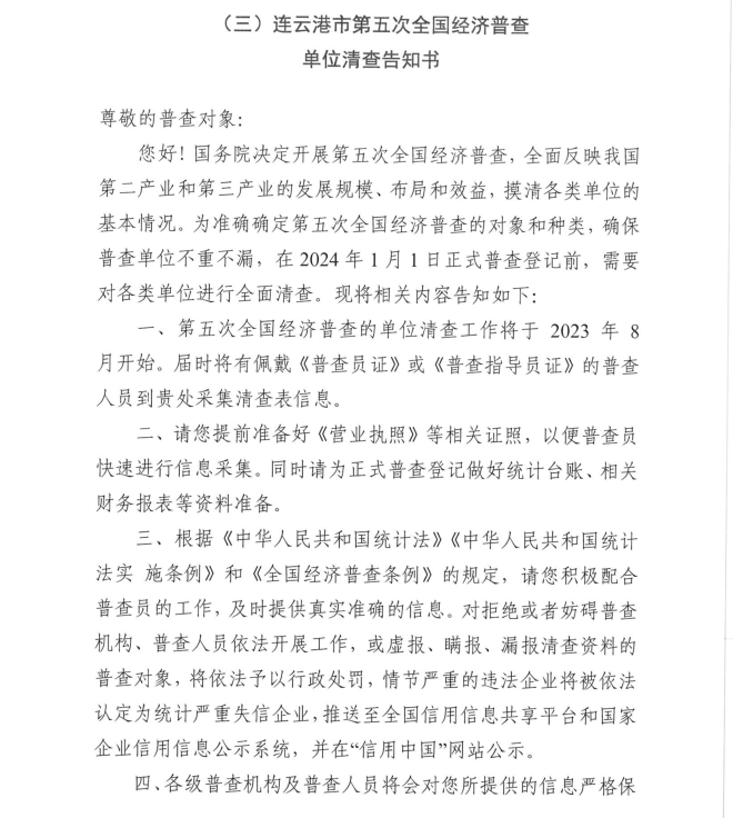按照《全國經(jīng)濟(jì)普查條例》規(guī)定,國務(wù)院決定于2023年開展第五次全國經(jīng)濟(jì)普查,為提高經(jīng)濟(jì)普查質(zhì)量,進(jìn)一步推進(jìn)普查工作順利開展,公司按照上級第五次全國經(jīng)濟(jì)普查宣傳動(dòng)員工作要求,現(xiàn)將《連云港市第五次全國經(jīng)濟(jì)普查單位告知書》公示如下: